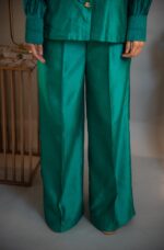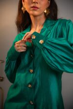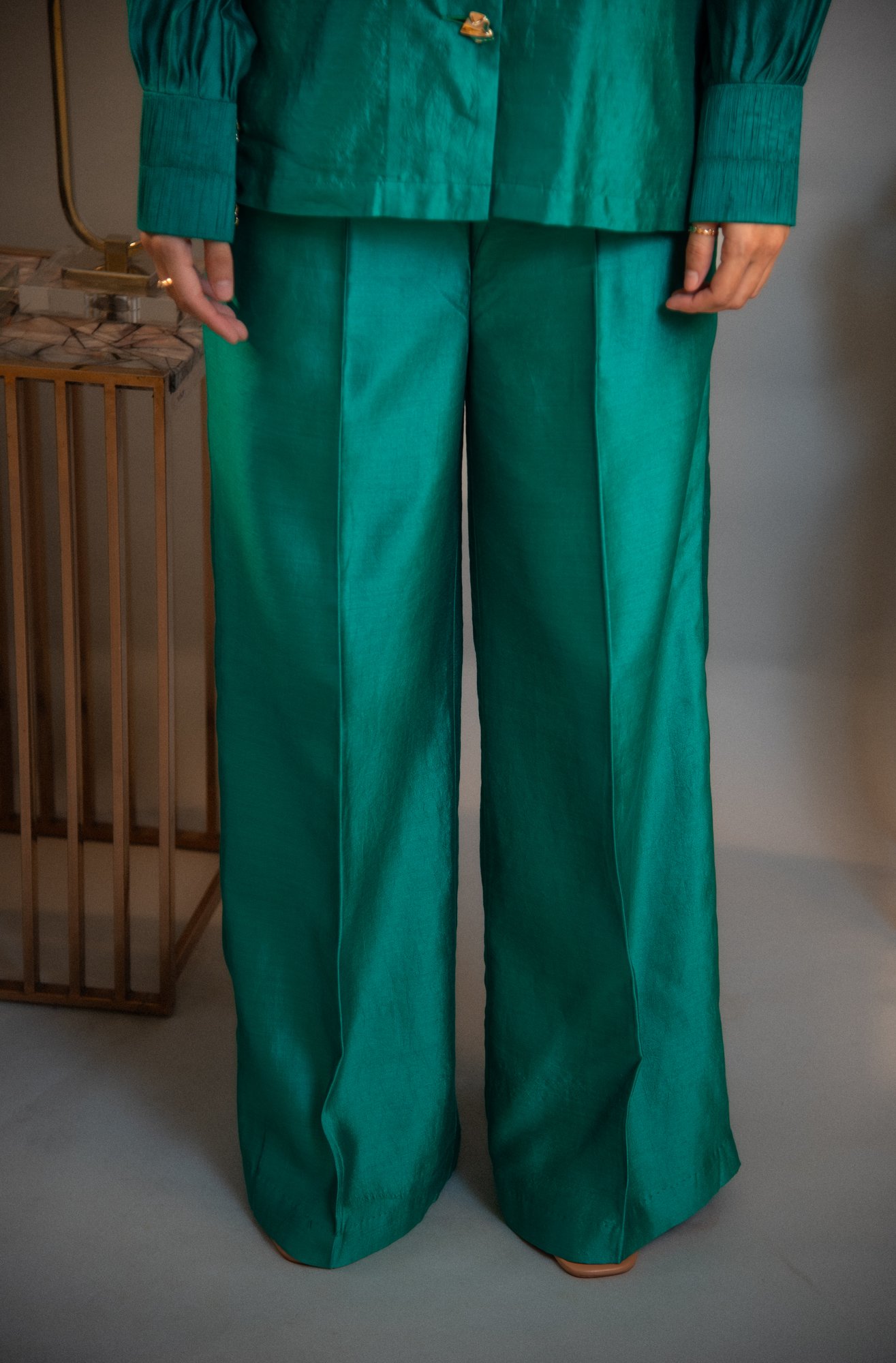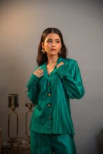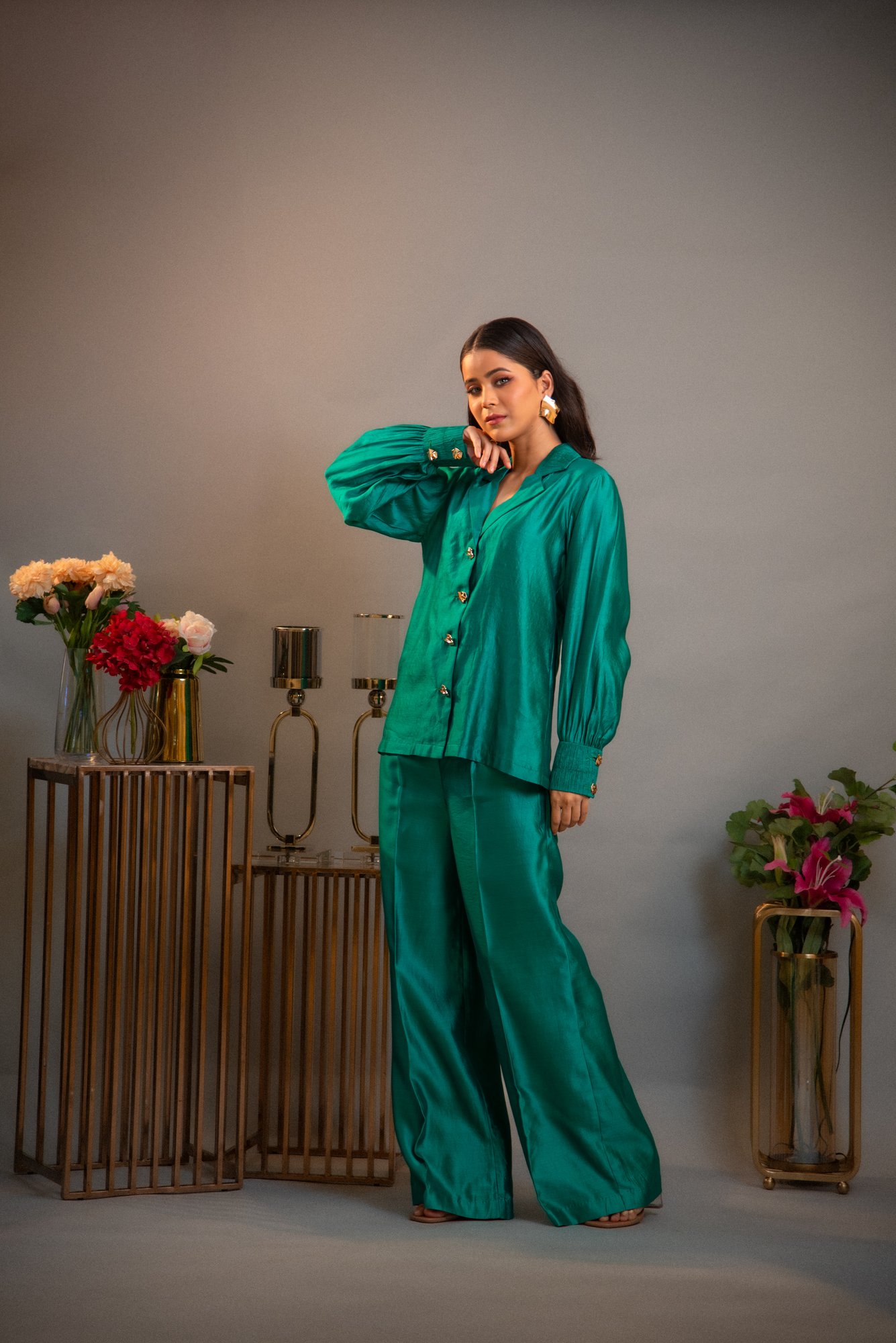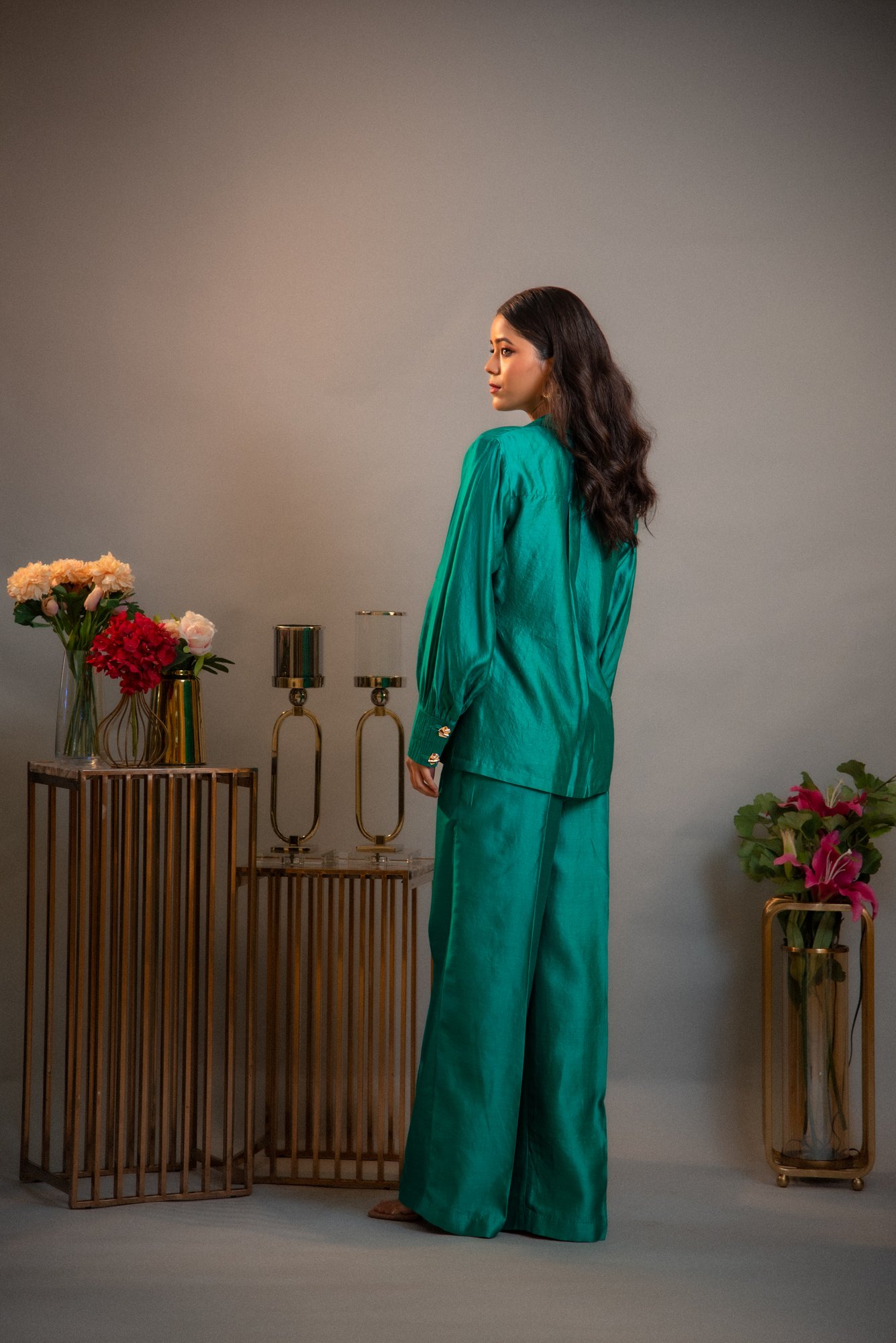 This timeless emerald shirt-pant set exudes contemporary elegance. The silk shirt with lapel features ruched details for refined texture. It is paired with straight pants.