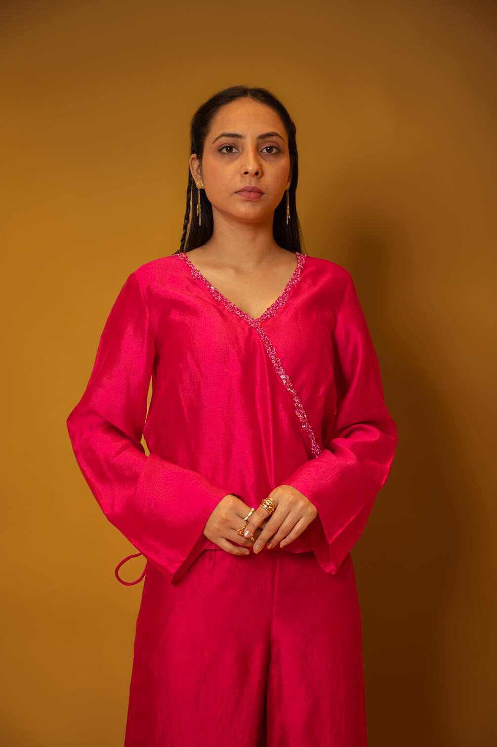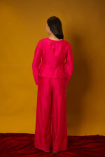 This relaxed wrap-over top and straight pant, crafted in silk, radiates opulence with effortless grace. The edges are delicately embroidered with opaque elements , while V-neckline and an asymmetric hem lend a refined, contemporary finish.