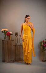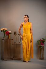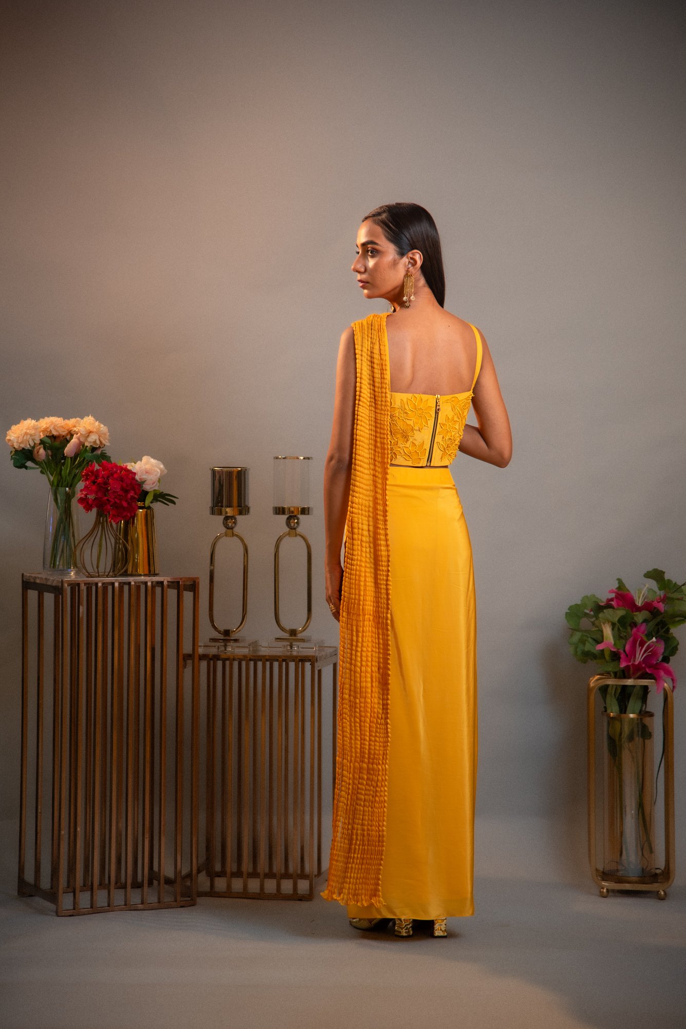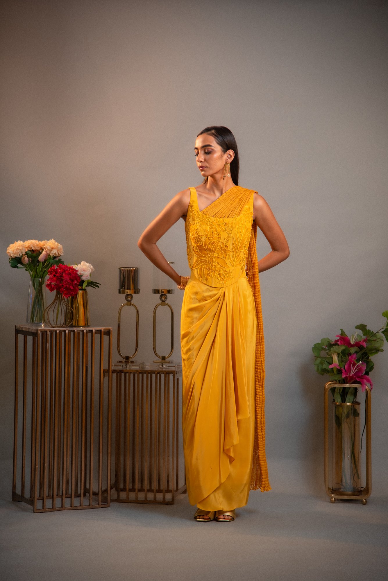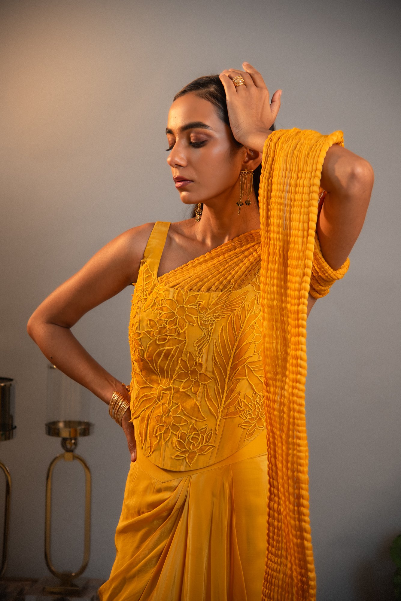 The yellow concept sari with corset offers a contemporary take on the traditional, featuring a draped satin skirt and a stylish corset for a chic look. Complete the outfit with heels and statement earrings for a sophisticated finish.