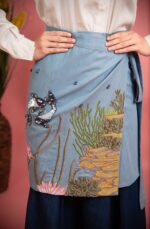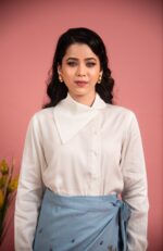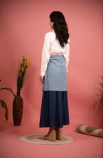 Marine-inspired georgeous honeycomb embroidered wrap over, paired with a denim maxi skirt and an asymmetrical collared white shirt.