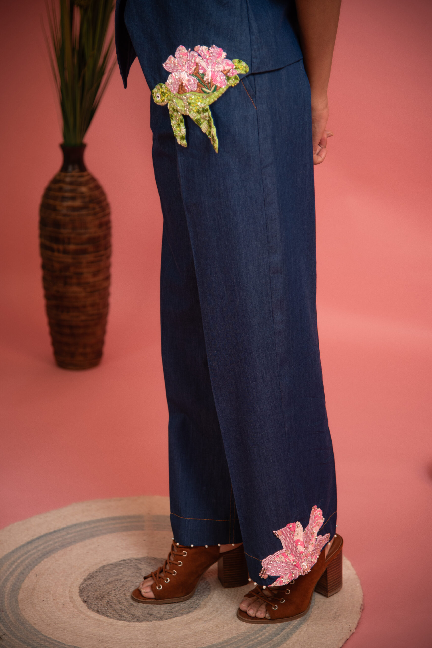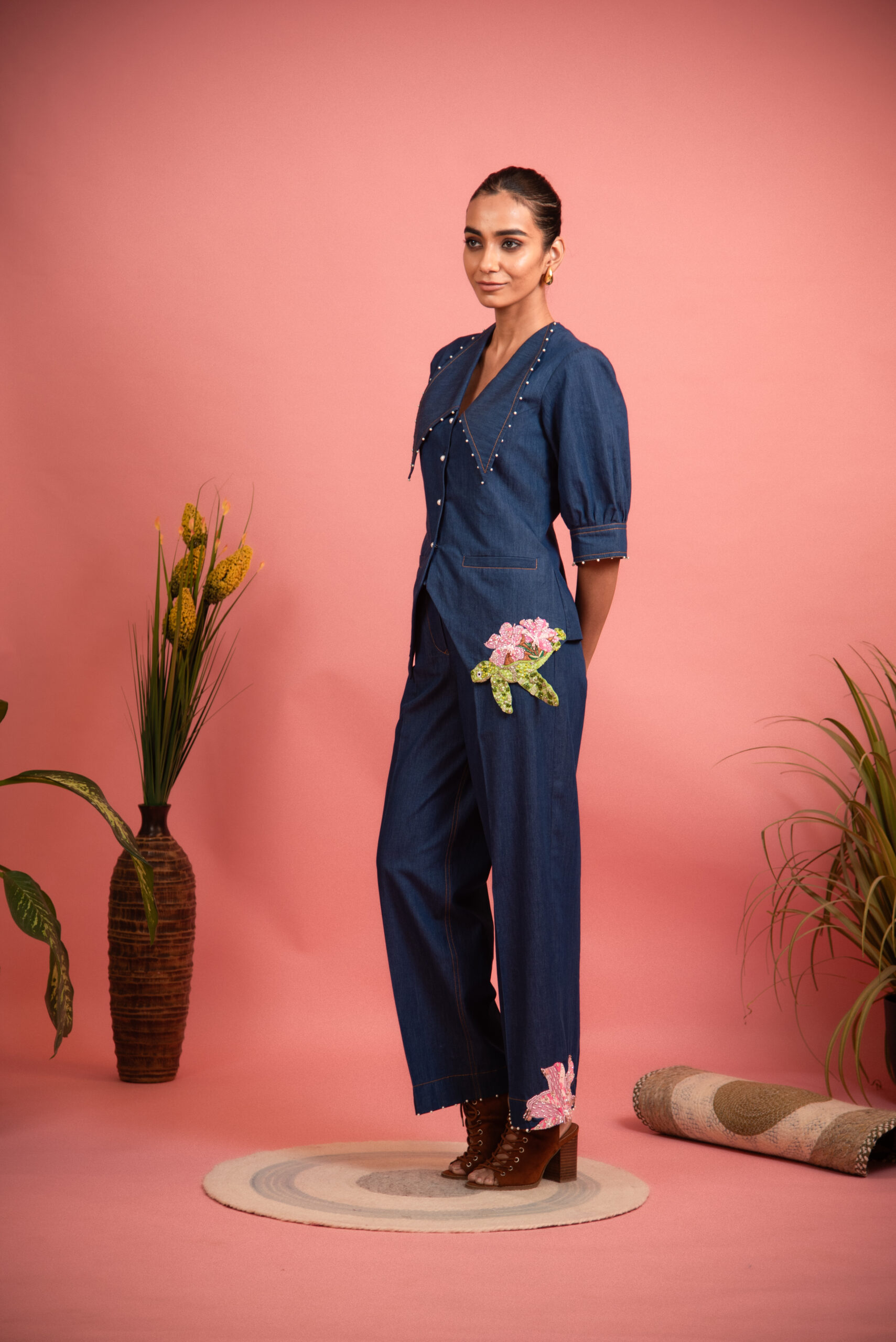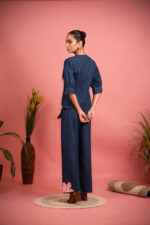 Exude effortless everyday style with this blue co-ord set, featuring peter pan collar, pearlescent embellishment at hem and relaxed-fit pants. Tropical embroidery on the top and on the pants finish this refined creation.