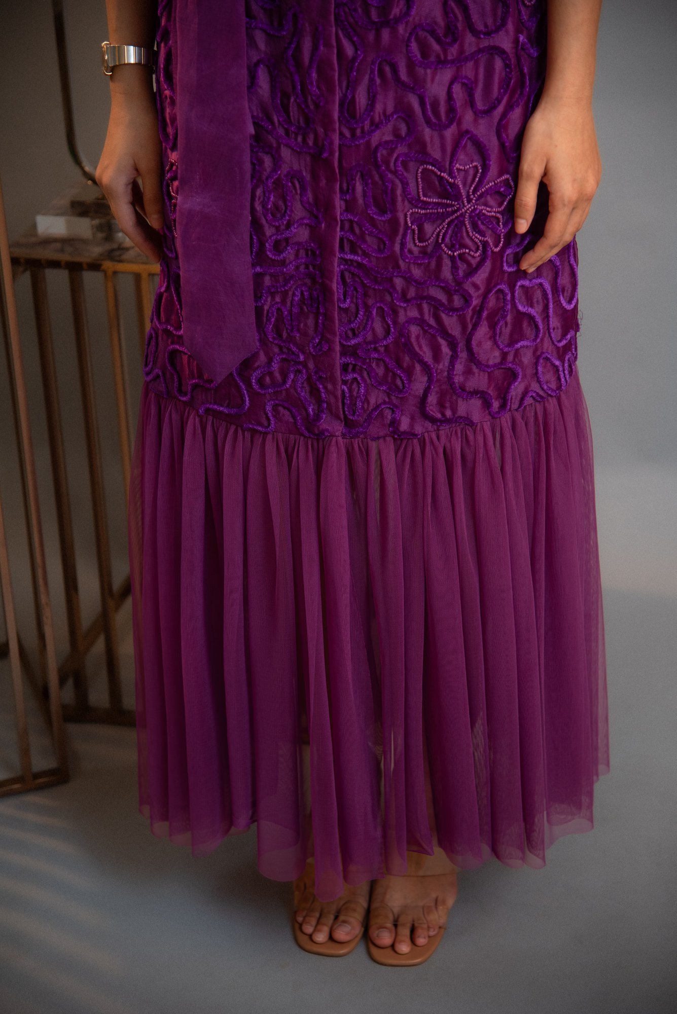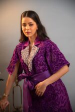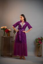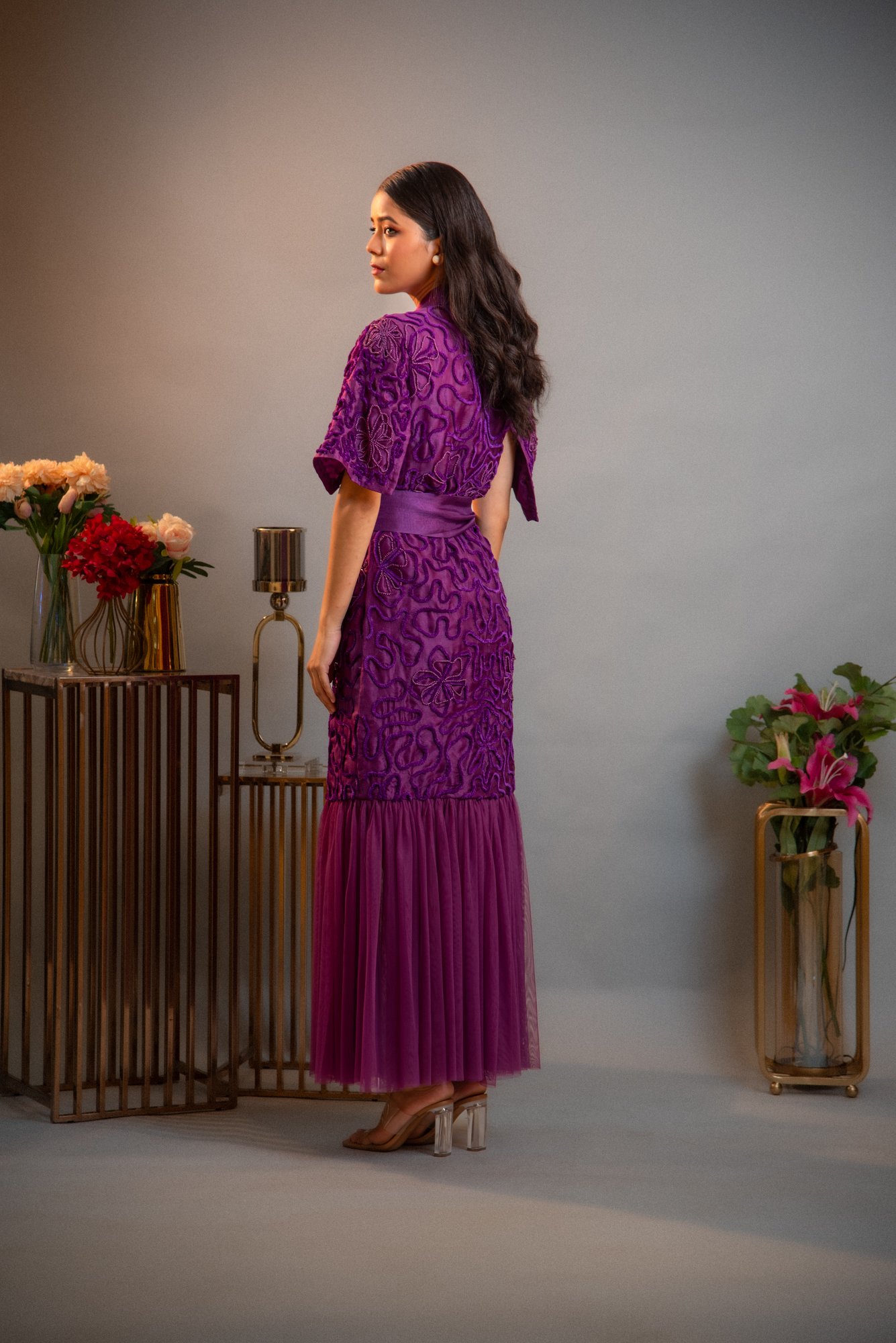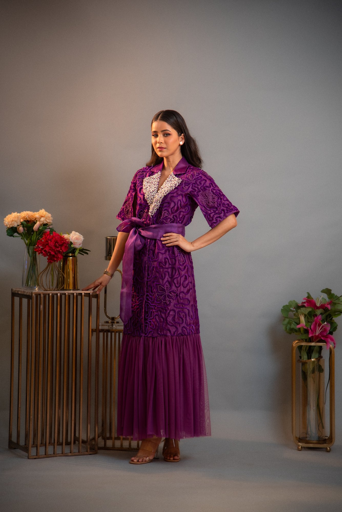 The violet tulle embroidered trench coat set features an art deco-inspired tulle trench coat highlighted with intricate crystal pearl embroidery on collar. It includes cape sleeves. Designed with couture craftsmanship for elevated festivities.