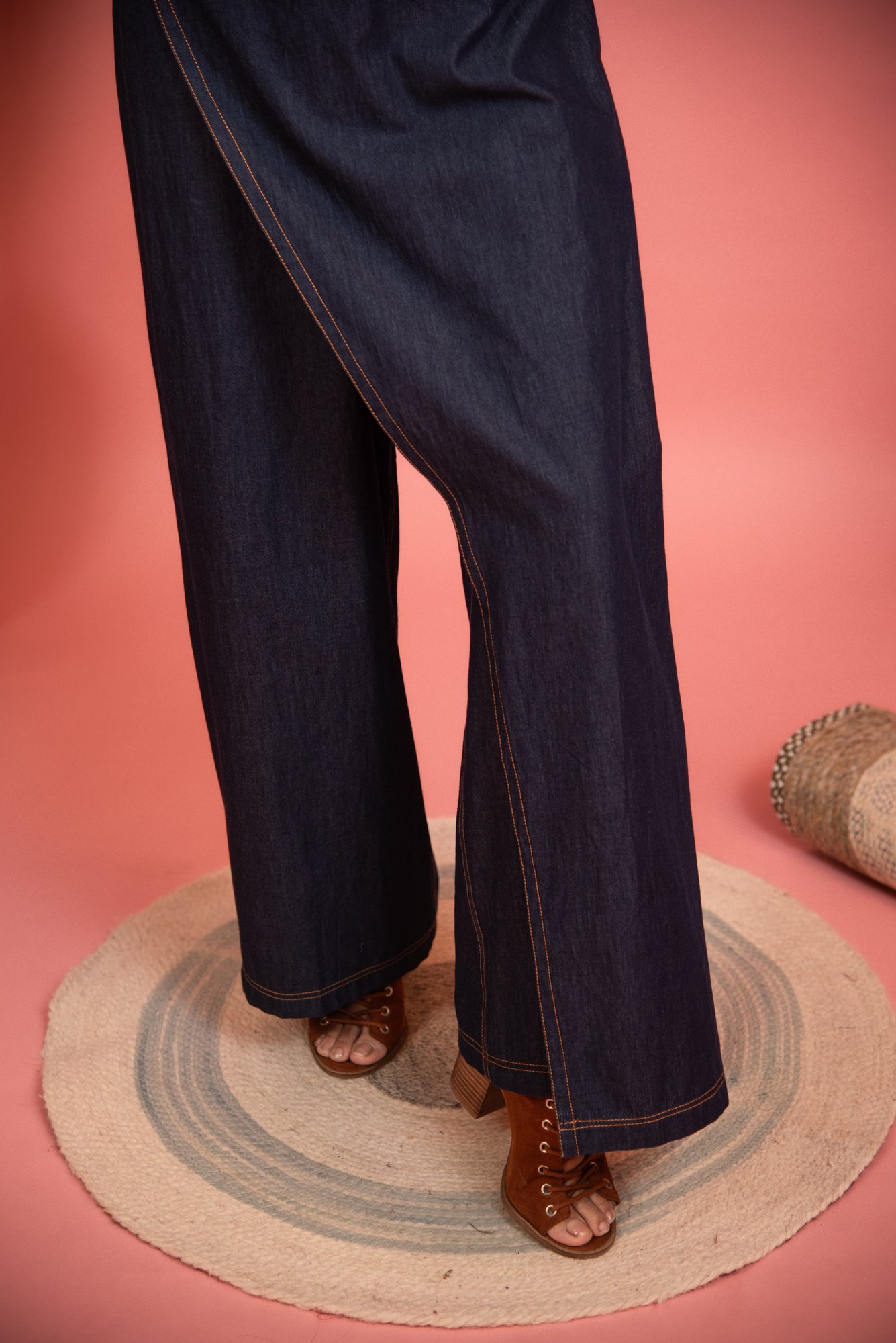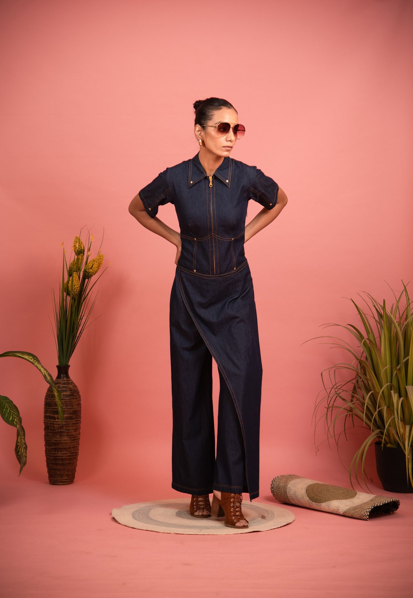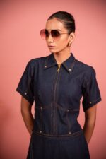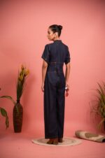 The navy blue denim jumpsuit features a corset pattern, detailed with revit buttons, wide-leg fit, and wrap-around pants for comfort and flair. Ideal for casual outings or travel, pair it with platform sandals for a stylish, statement look.