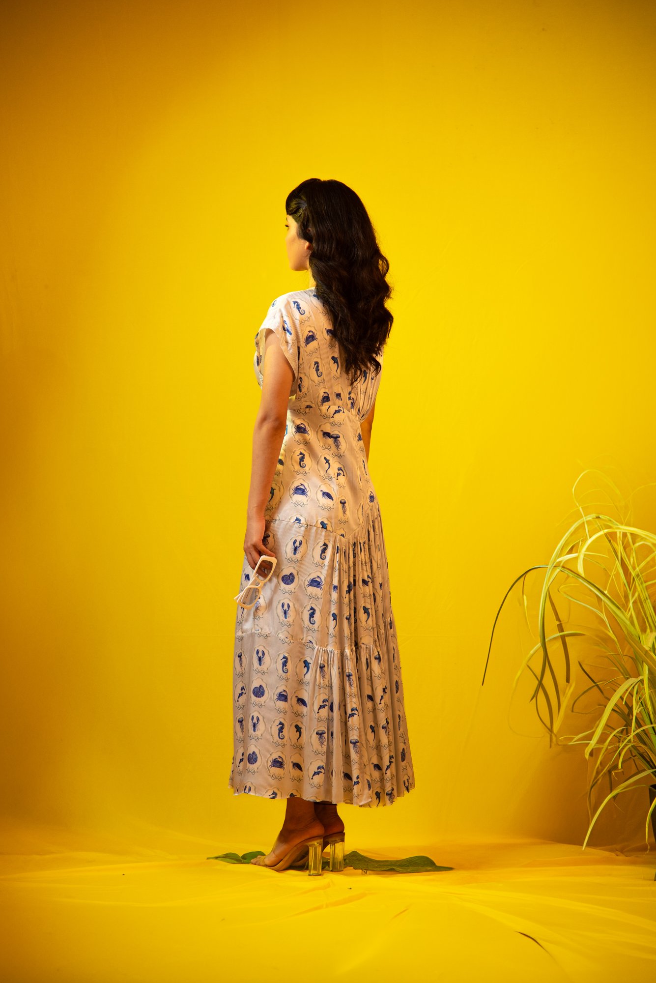 This soothing white sleeveless dress redefines youthful elegance with side cut-out and gather detailing along the seam. Its playful silhouette is both soft and refined. Crafted in satin with marine detailing print, it oozes chic sophistication.