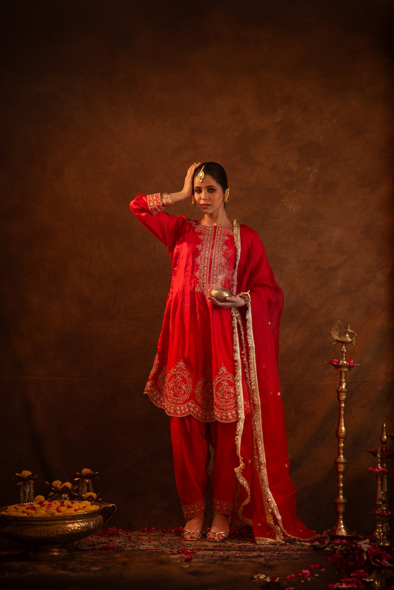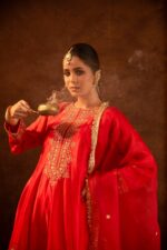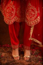 Crafted in bold red silk with scallop and delicate marodi detailing, this kurta-salwar set shines with intricate dori and dabka embroidery along the neckline and sleeve cuffs, exuding festive charm. Paired with an embroidered organza dupatta.