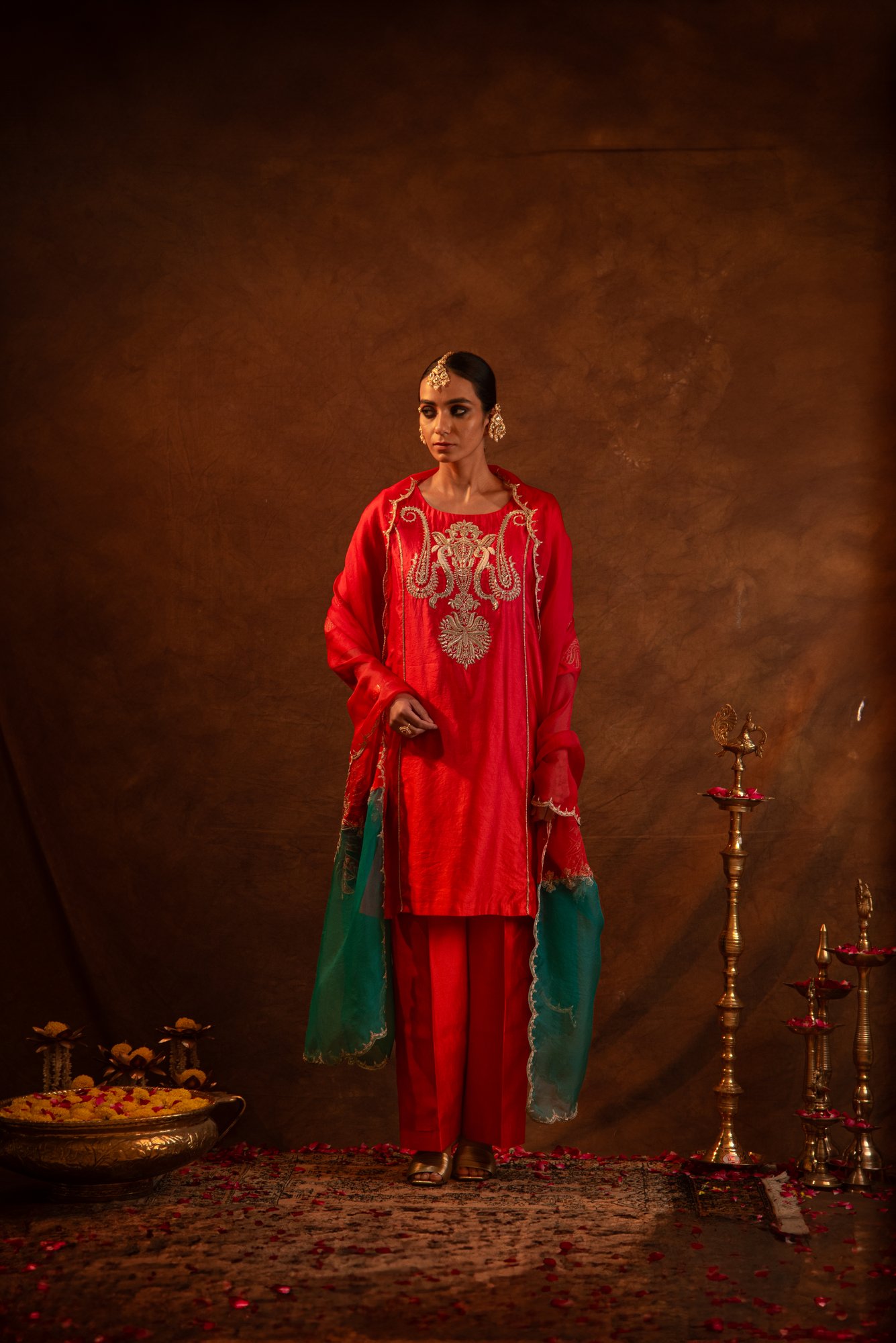 This soothing red unic set exudes refined vibrance. The short embroidered kurta pairs with silk pants and a dupatta finished with colour contrast accents. Intricate aari and zardozi embroidery celebrate Indian heritage craftsmanship.