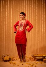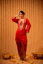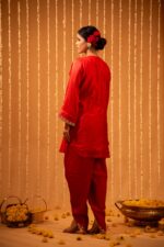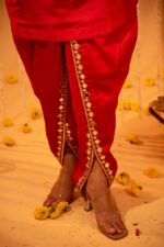 Reflect heritage and vintage styles with sleek elegance with these red silk dhoti pants. A draped kurta with a keyhole -neck silhouette, the dhoti are subtly lined with mirror and gota patti work for a festive touch.