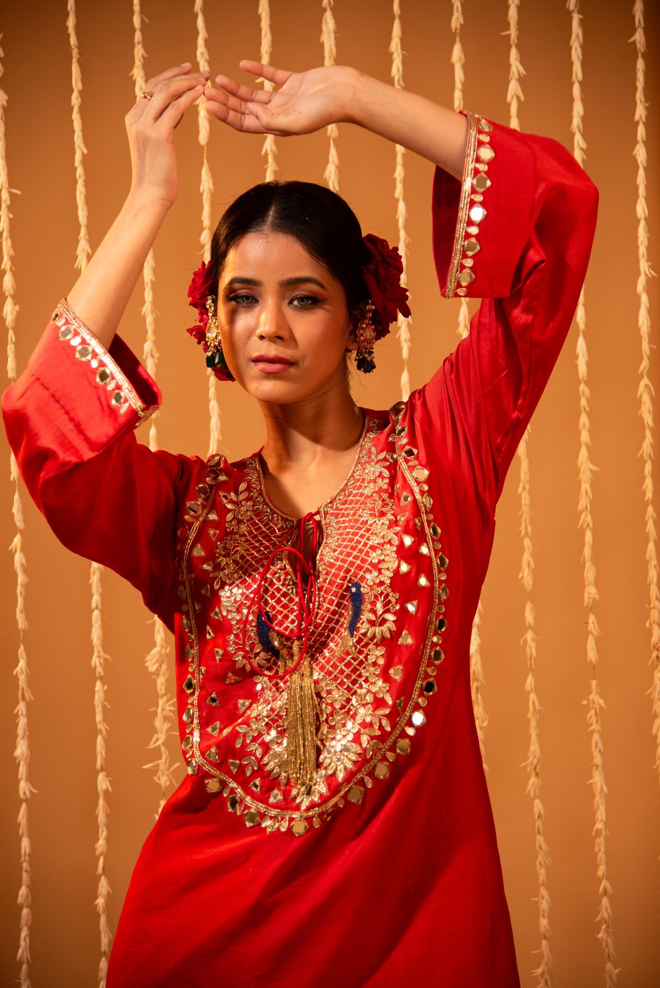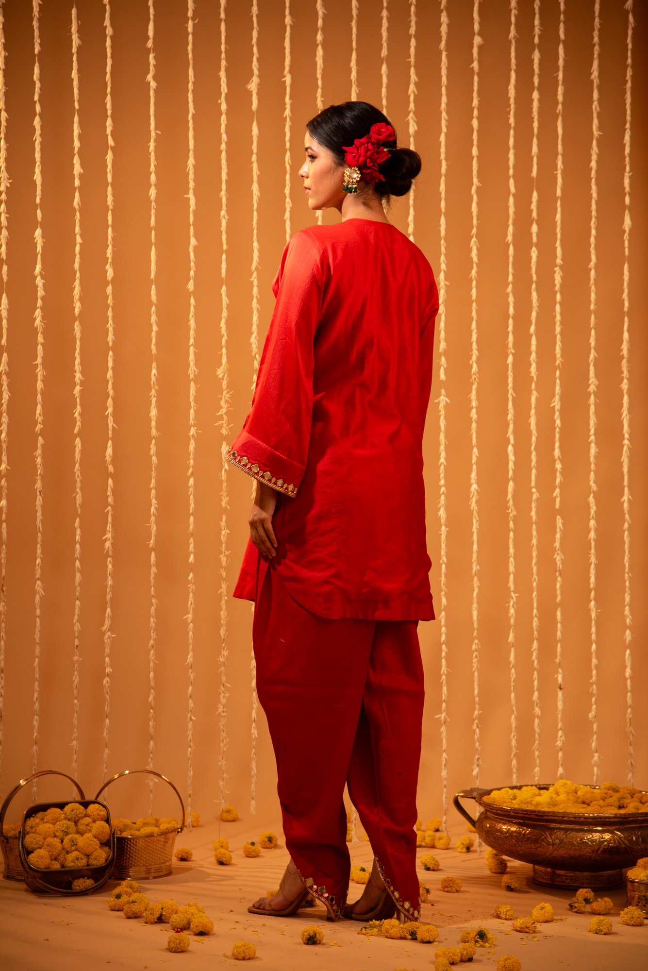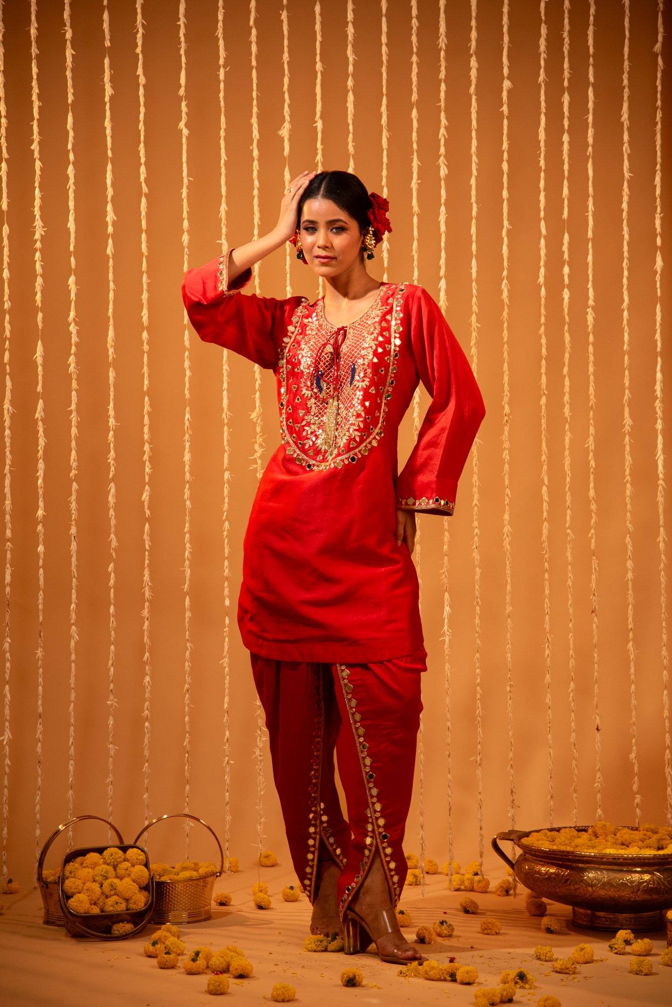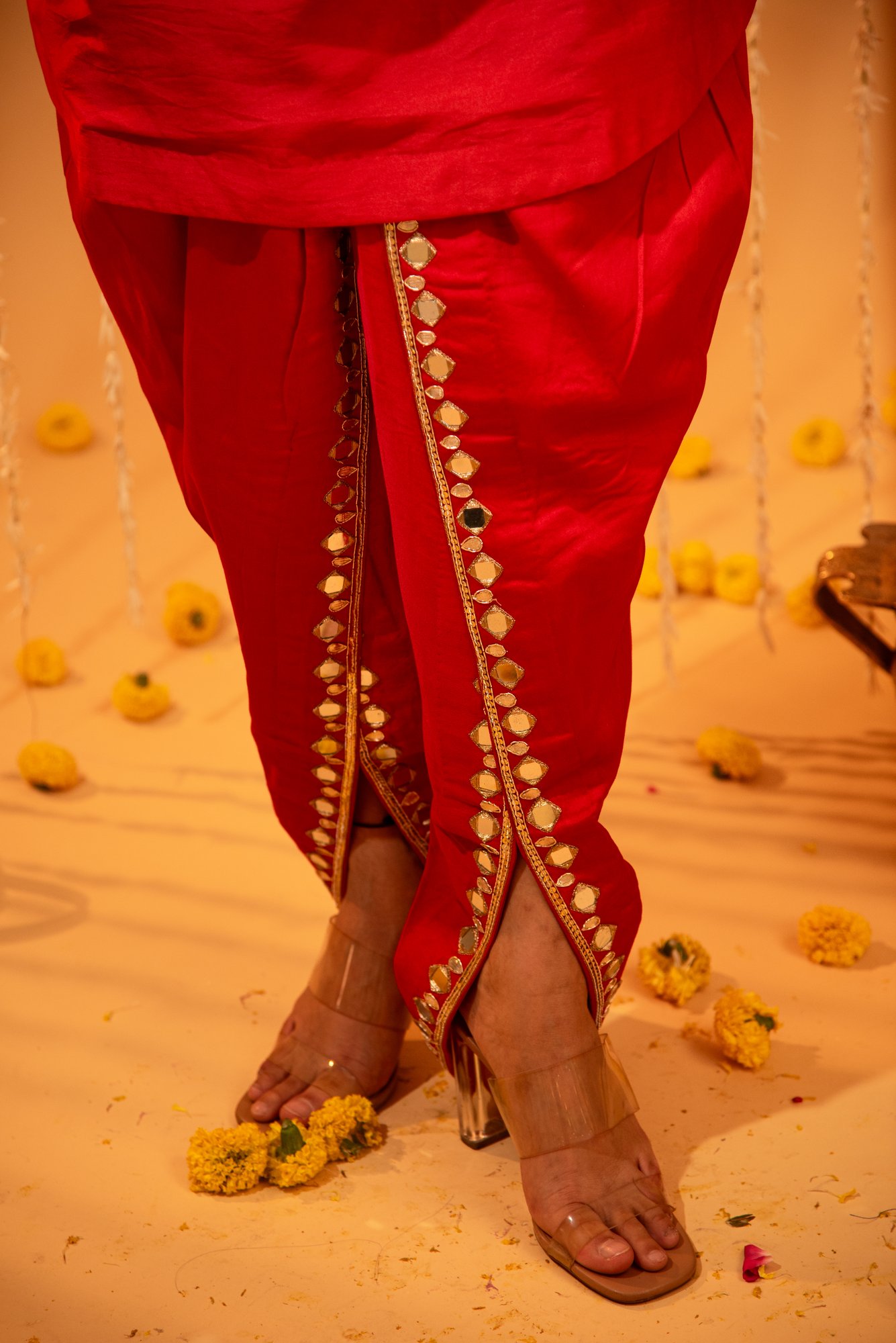 Red Silk Mirror & Gota Patti Dhoti-Style Pants Set