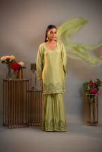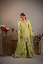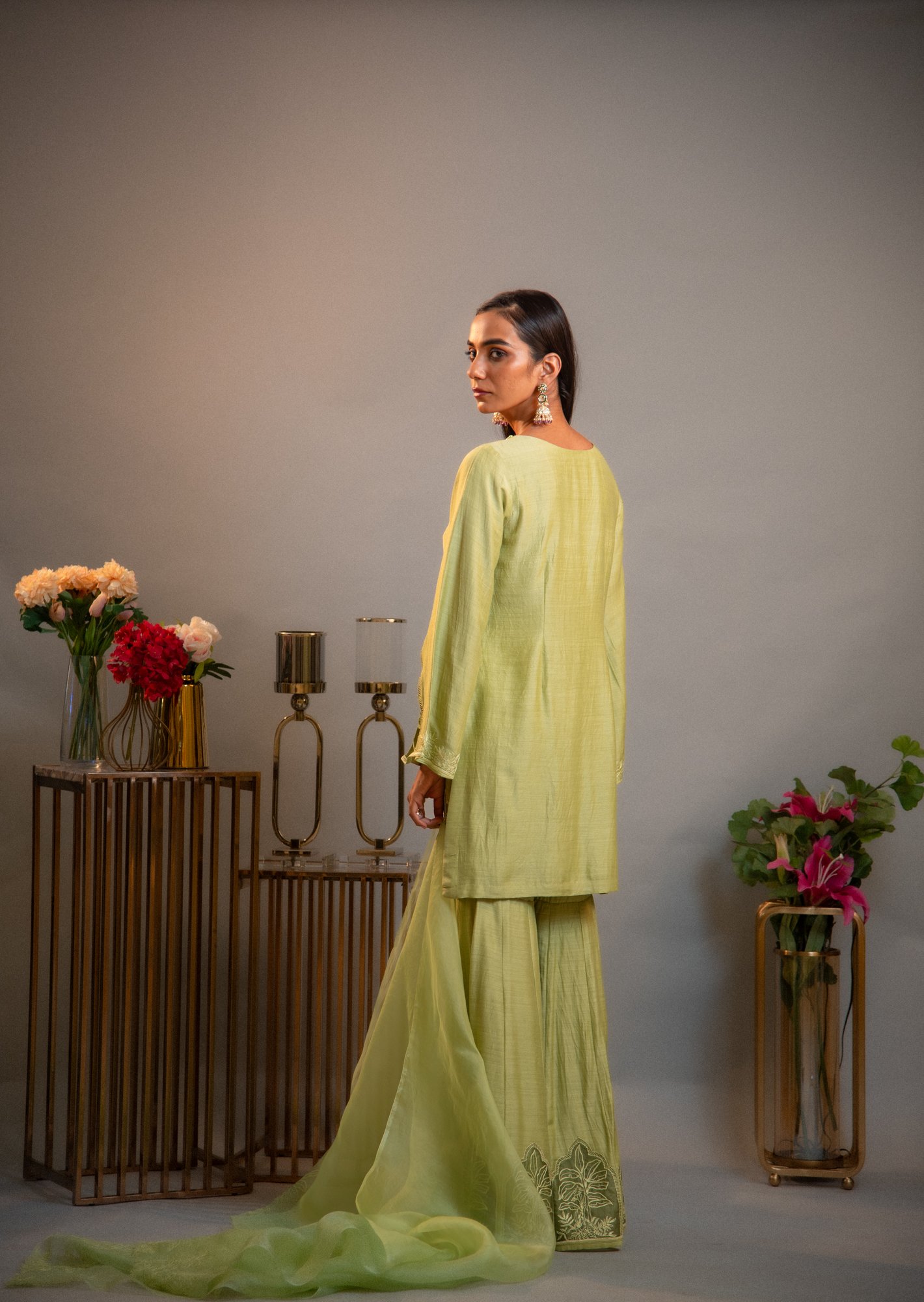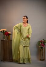 Elegant in munga silk , this set features a V-neck kurta with long sleeves and flowing sharara pants. The design is highlighted with cutwork, floral embroidery, styled with an embroidered organza dupatta.