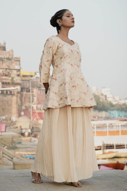 Beige Hand Embroidered Banarasi Silk Peplum Top-Plazzo set