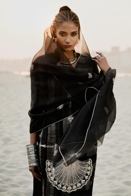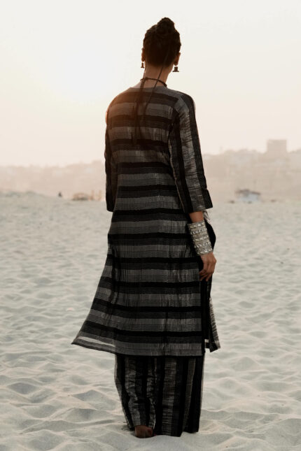 Black Stripe Banarasi Silk Embroidered Kurta Set