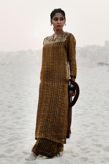 Brown Banarasi Silk Embroidered Long Kurta Set