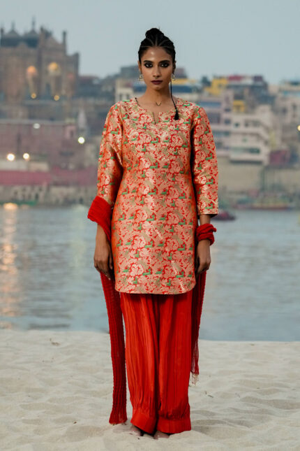 Red Embroidered Banarasi Silk Brocade Kurta Set