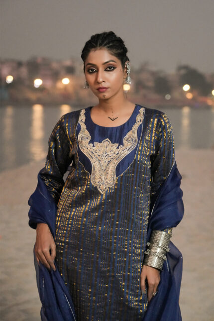 Blue Banarasi Cotton Silk Stripe Kurta Set