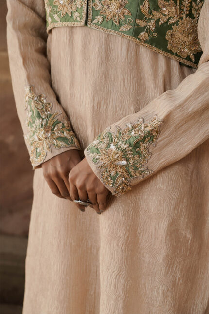 Beige Moulded Banarasi Cape Top-Skirt Set