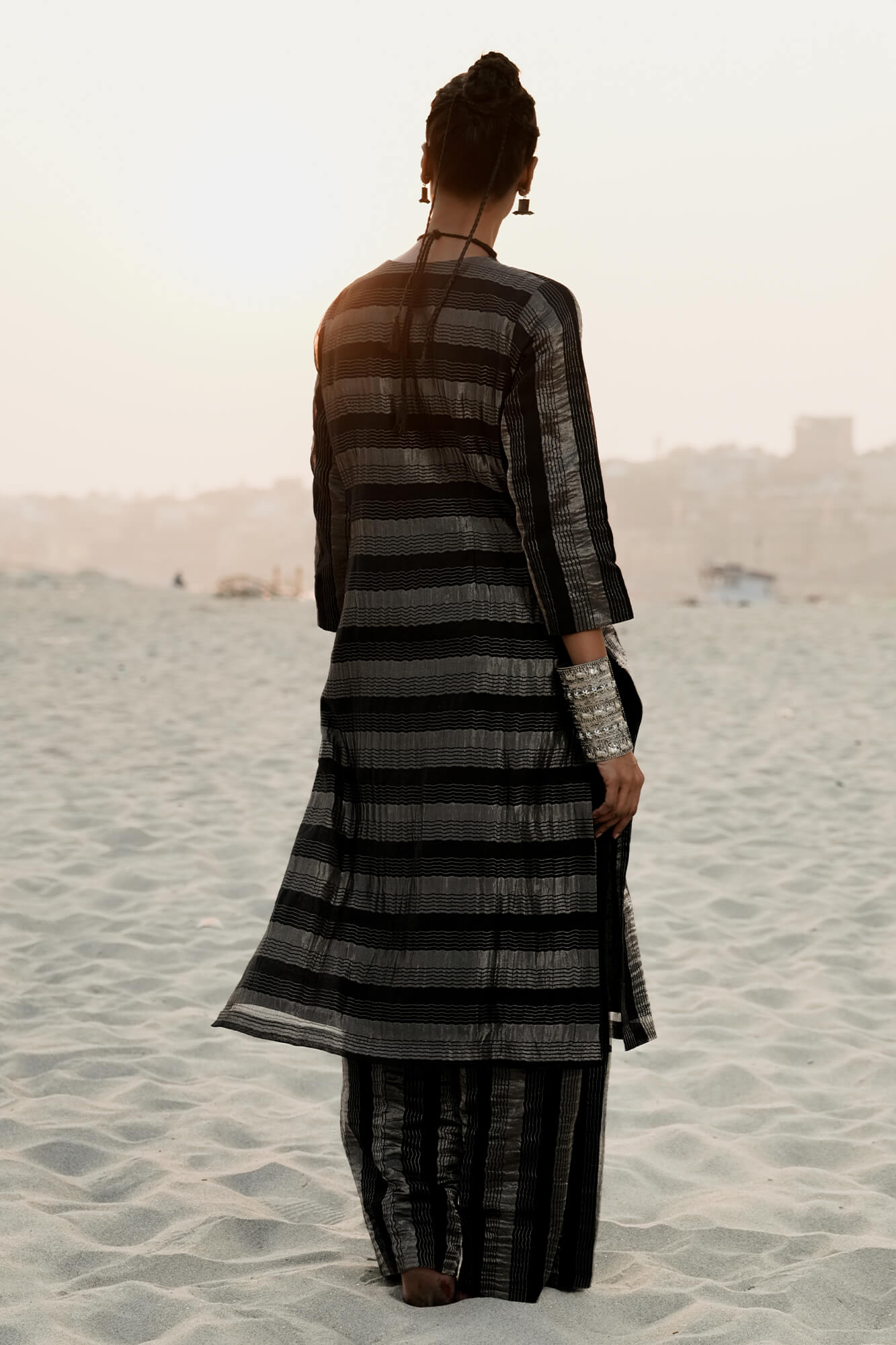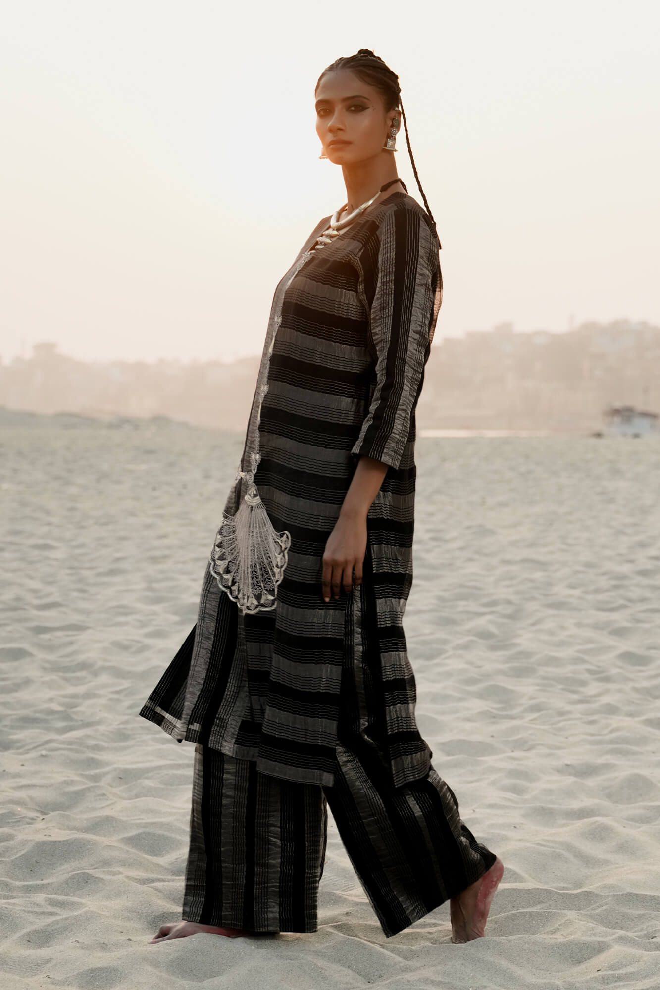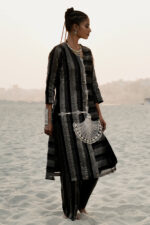 This Black strip cotton silk tissue kurta set is an ode to refined craftsmanship and design philosophy . The straight cut kurta features handcrafted floral motifs set in zardozi embroidery, offering refined texture. It is paired with straight plazzo.