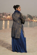 Merging fabric block with tailored stripe elements, this blue handwoven silk-cotton piece features a round neckline and quarter sleeves. Blue textured bottom accent the base, adding handwork depth and contemporary elegance.