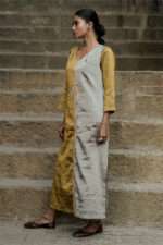 This gold-silver long dress exudes artisanal elegance with a v- neck, high side slit both side, and contrast embellishment along the high edge. Hand-embroidered with traditional motifs in Dabka and Aari work and antique-toned brass tessel detailing. Ideal for parties.