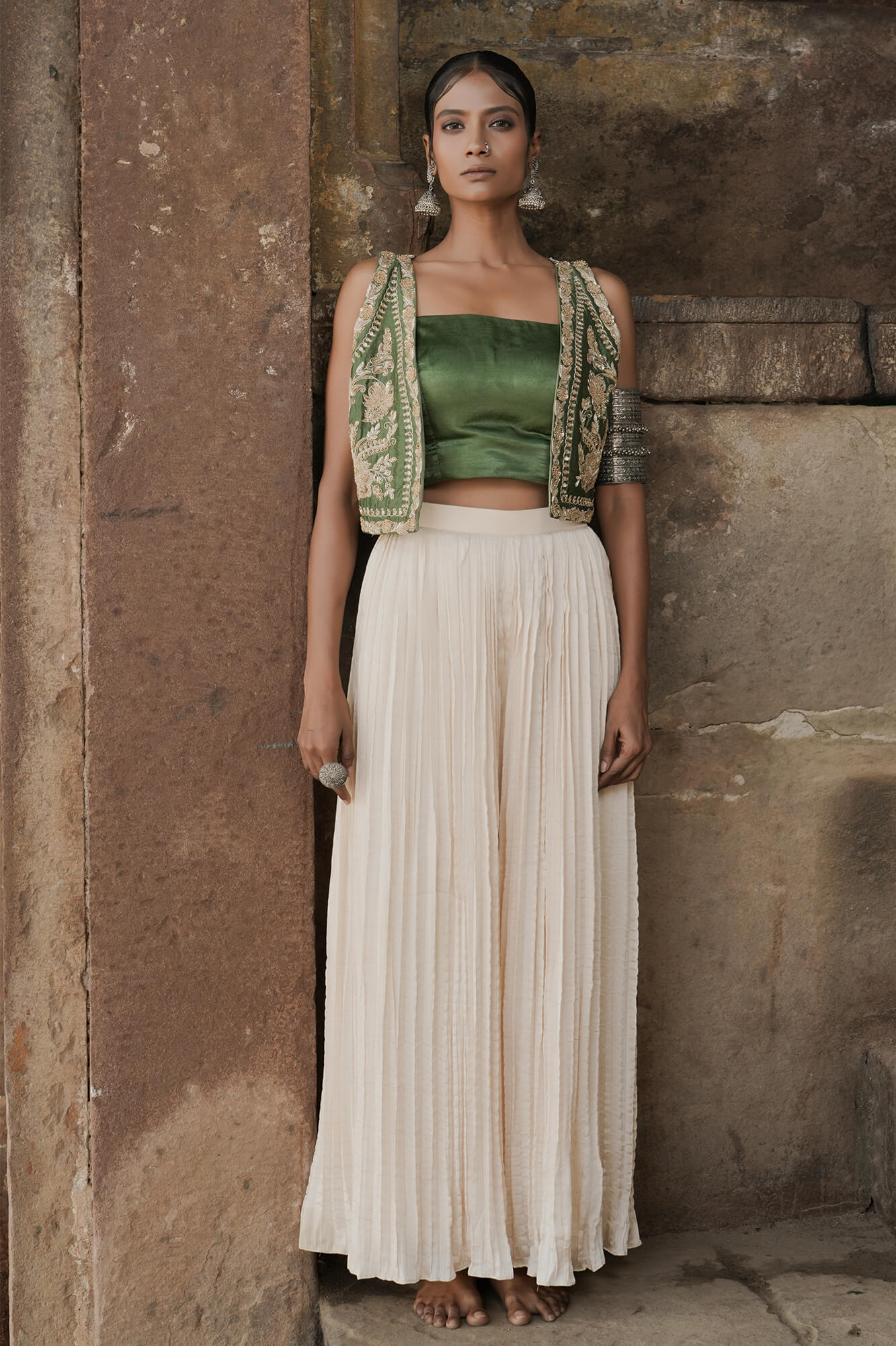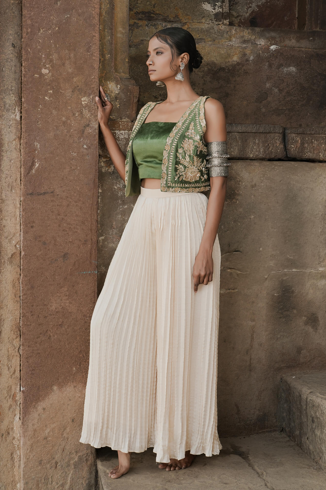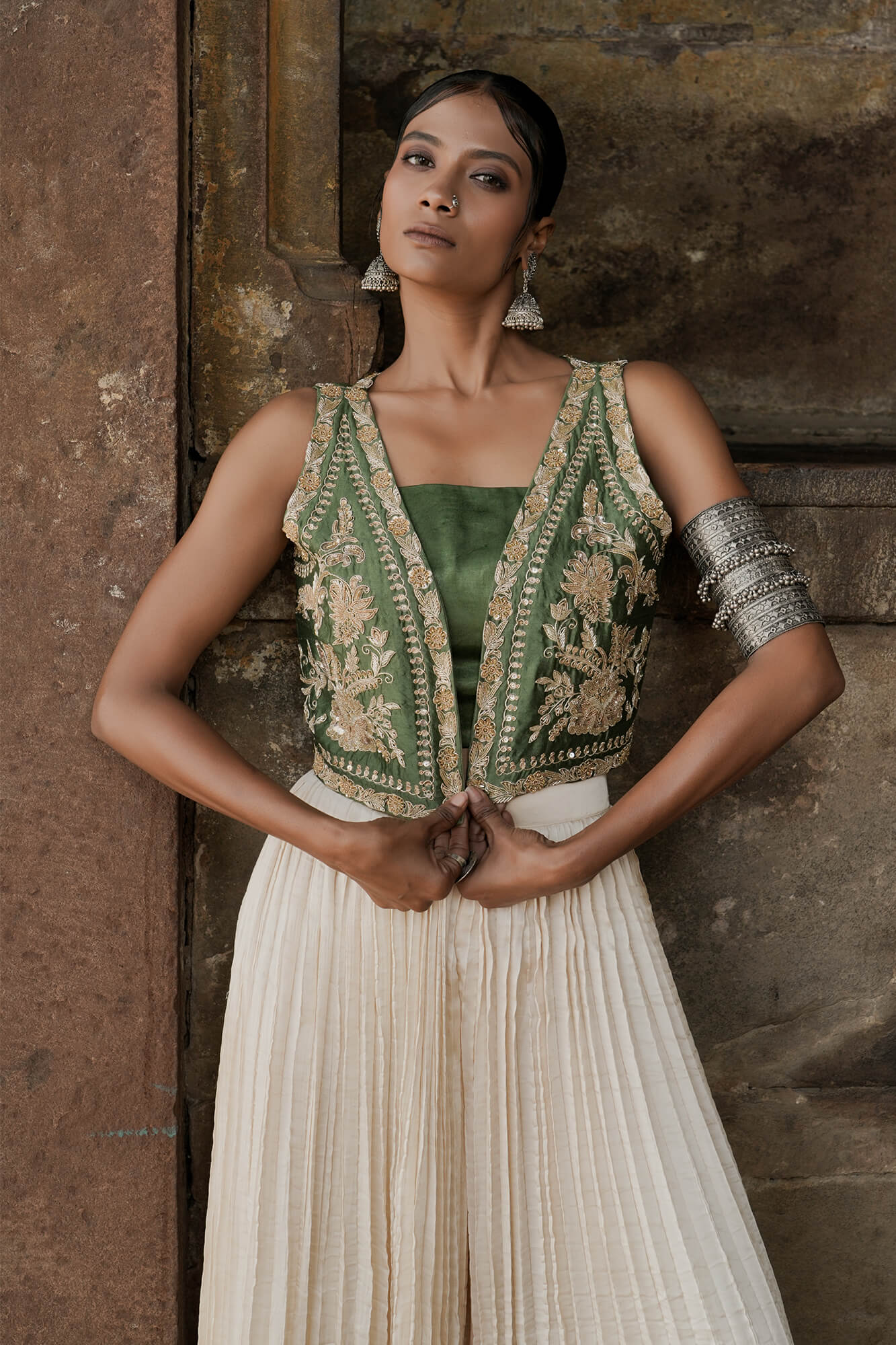 This silk olive fully embroidered jacket is adorned with zardozi gold detailing.It completes with a satin crafted bustier pair with a stylish cream plazzo having hand finished textured, exuding refined elegance.